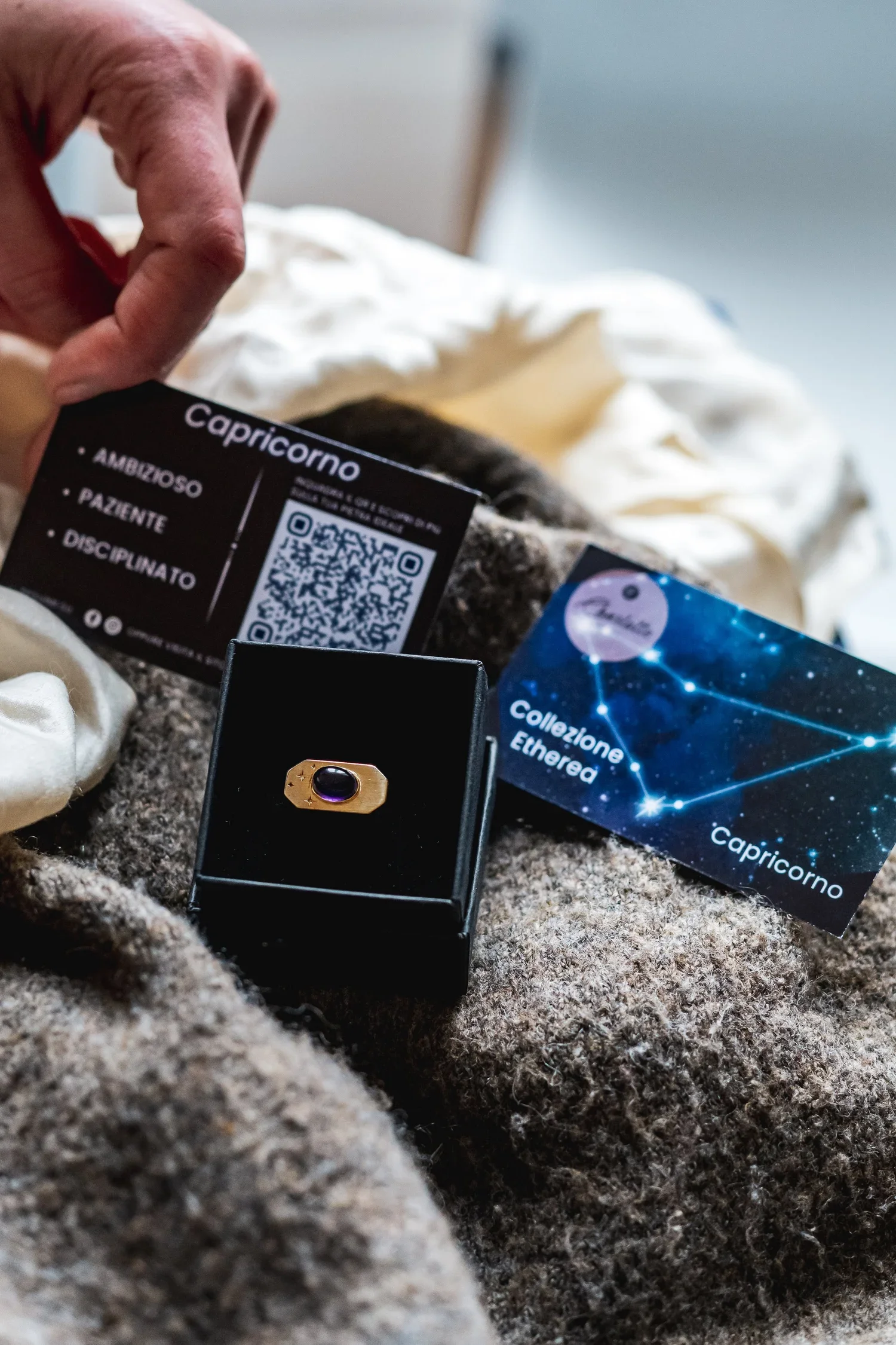L’anello nasce da due passanti che si uniscono armoniosamente: uno dalla forma ovale, l’altro dalla silhouette più squadrata. Un contrasto pensato per evocare la dualità caratteriale del segno, capace di accogliere opposti e trasformarli in equilibrio. A fare da ponte tra queste due nature, la pietra centrale, simbolo di integrazione e armonia interiore.